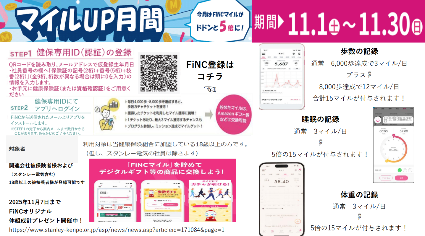 スタンレー電気健康保険組合では、11月1日~11月30日までFiNCマイルUP月間となっております。