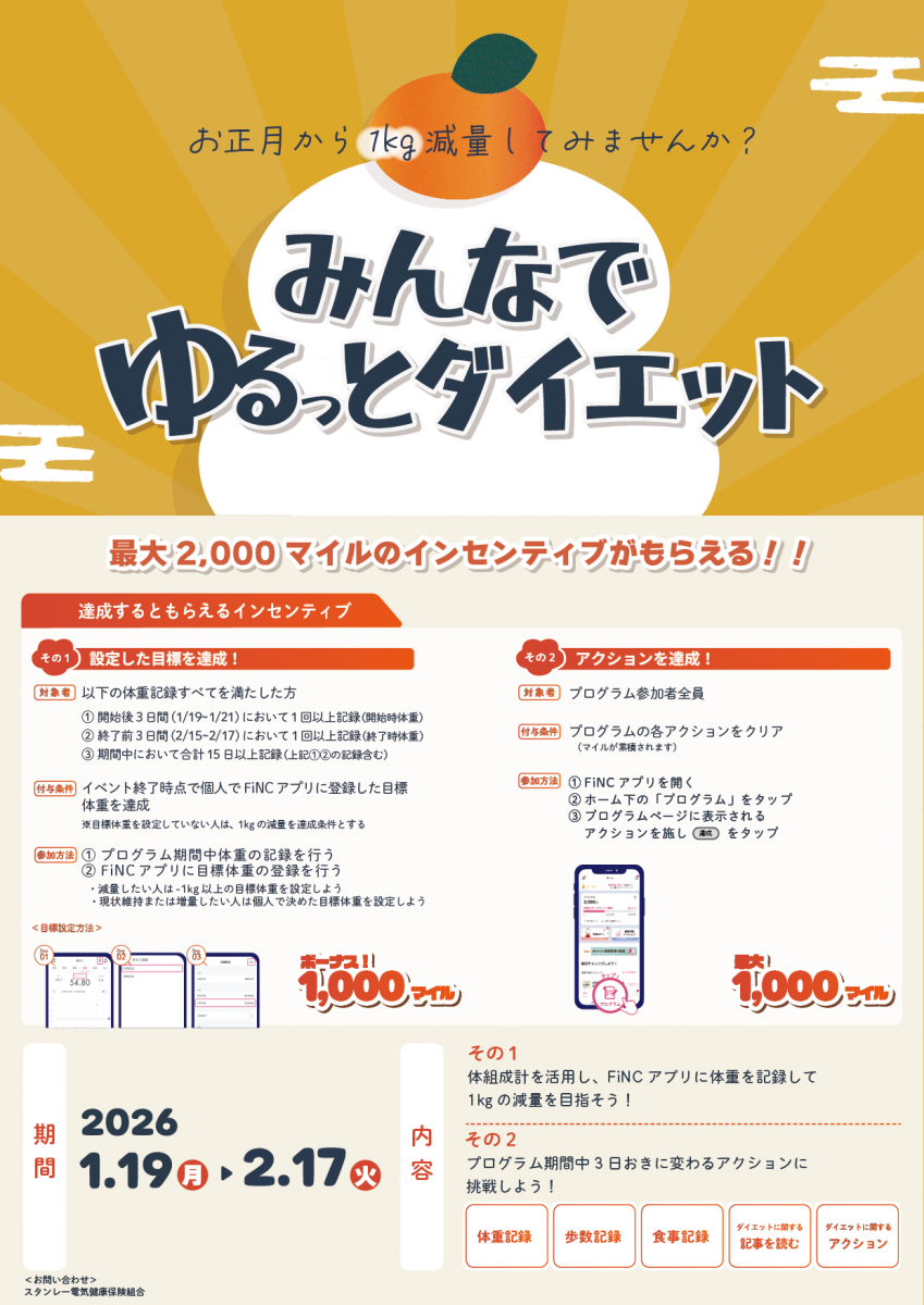 - [2026/01/12]NEW 【FiNCお知らせ】1/19~2/17みんなでゆるっとダイエット開催のご案内
