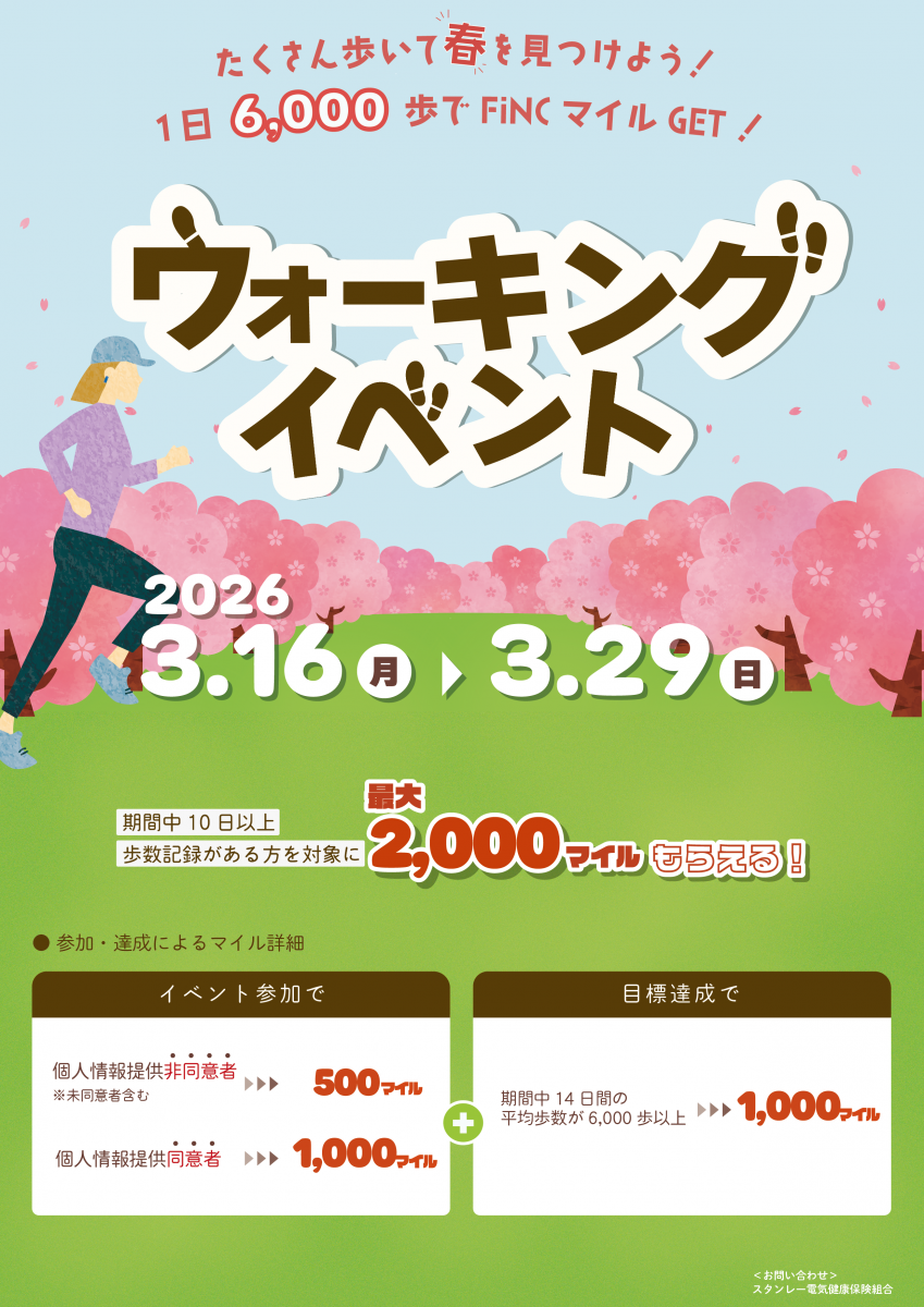 - [2026/03/06] 【FiNCお知らせ】3/16~3/29ウォーキングイベント開催の御案内